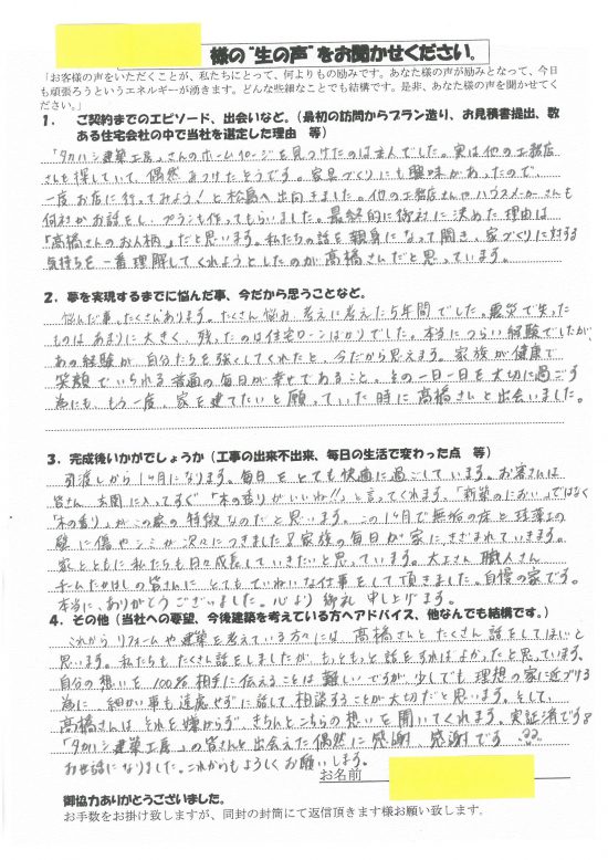 引渡しから1ヶ月になります。毎日をとても快適に過ごしています。お客さんは皆さん、玄関に入ってすぐ「木の香りがいいね!!」と言ってくれます。