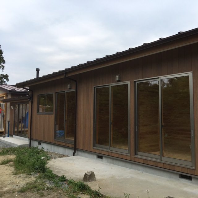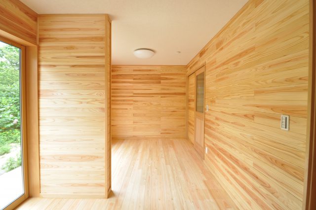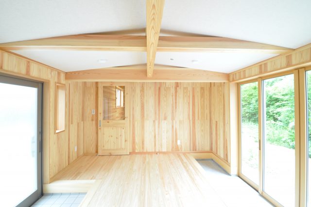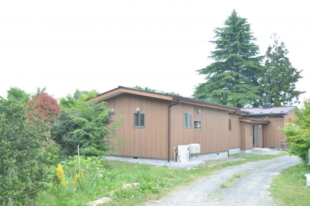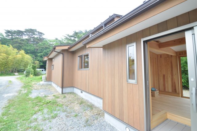 築40年ほどの平屋のお宅を、外観から内装まで改修。壁にも床にも無垢材を張り、木の香りでいっぱいの家になりました。数年前に伐採して土地の片隅に寝かせていたケヤキの丸太を加工してほしいというご相談を受け、この家にぴったりなテーブルとベンチもつくりました。