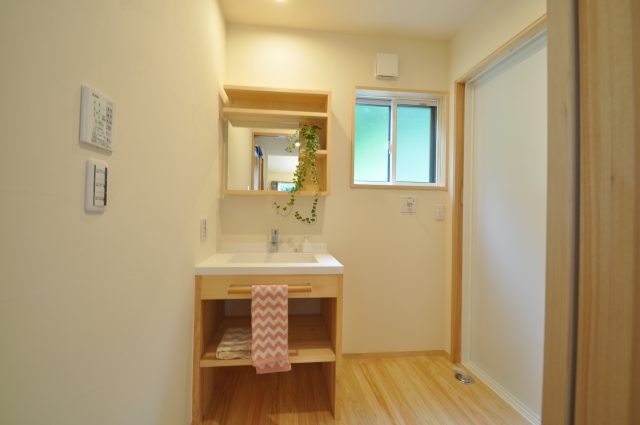 人工大理石天板シンクでお掃除もラクチン。タオルもおける鏡台も一緒に製作
