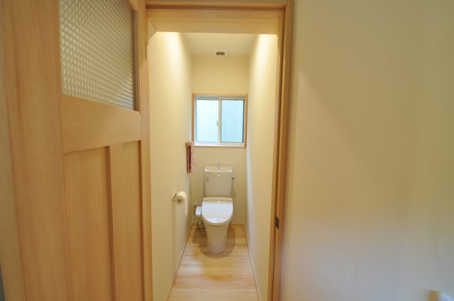 トイレ空間にはいえのわ特性の木のタオルホルダーと紙巻器