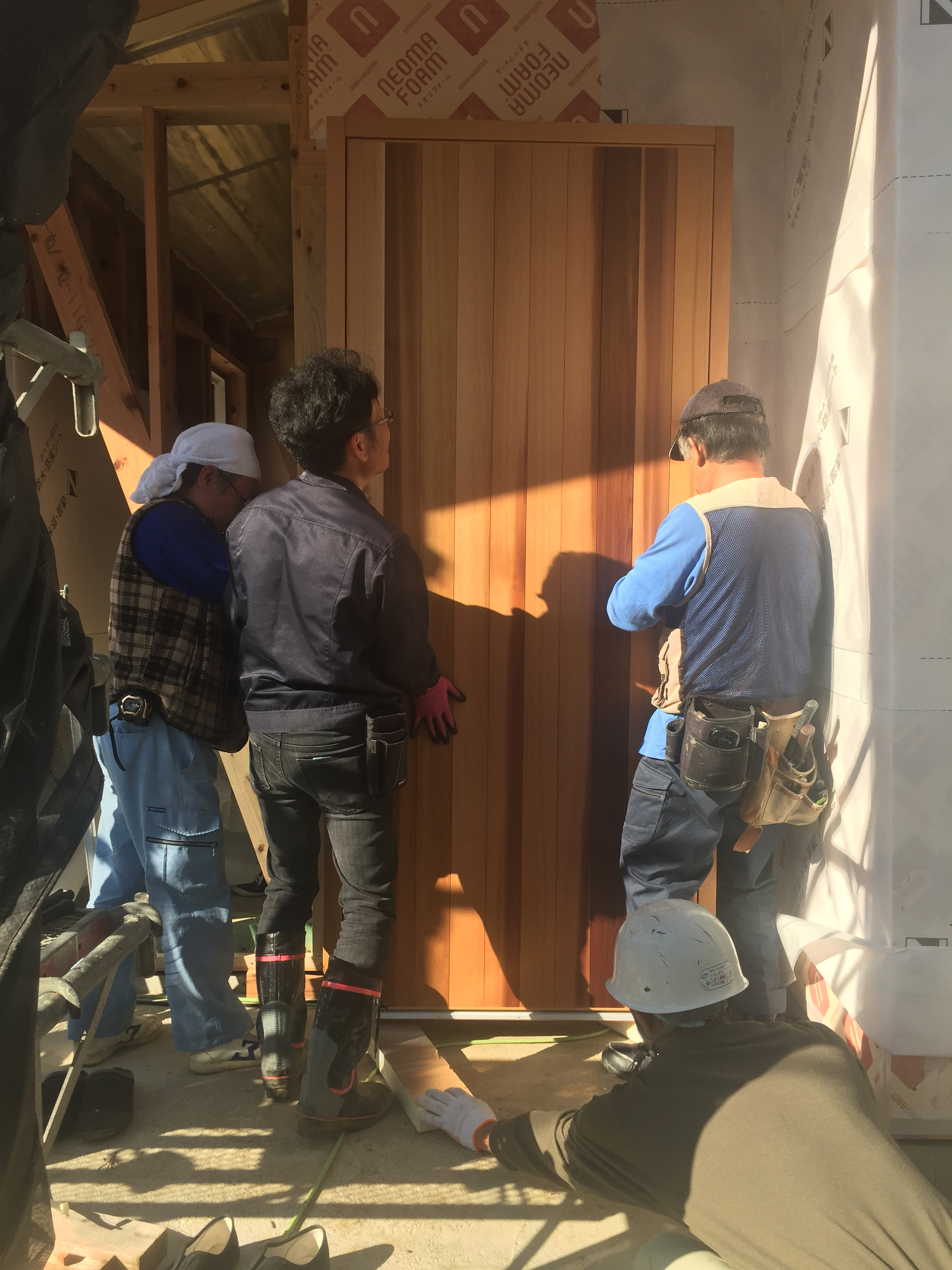 そして、中間検査の日は、いえの”かお”の玄関ドアが付く日でした!