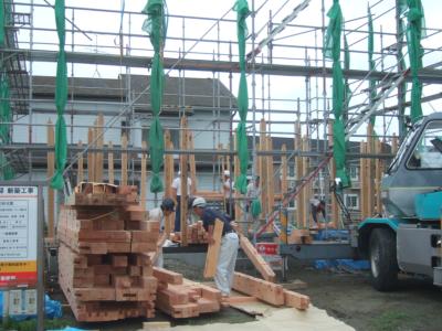 棟梁の掛け声の元、梁材を順番通りに架け渡していきます。