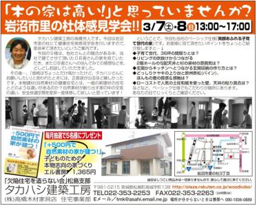皆さんこんにちは、いつも楽天ブログをご覧頂き大変ありがとうございます。 自然素材の木の家・自然素材リフォームが大好きな タカハシ建築工房 高橋芳人です。 いよいよ明日と明後日は岩沼市里の杜の完成体感見学会です。