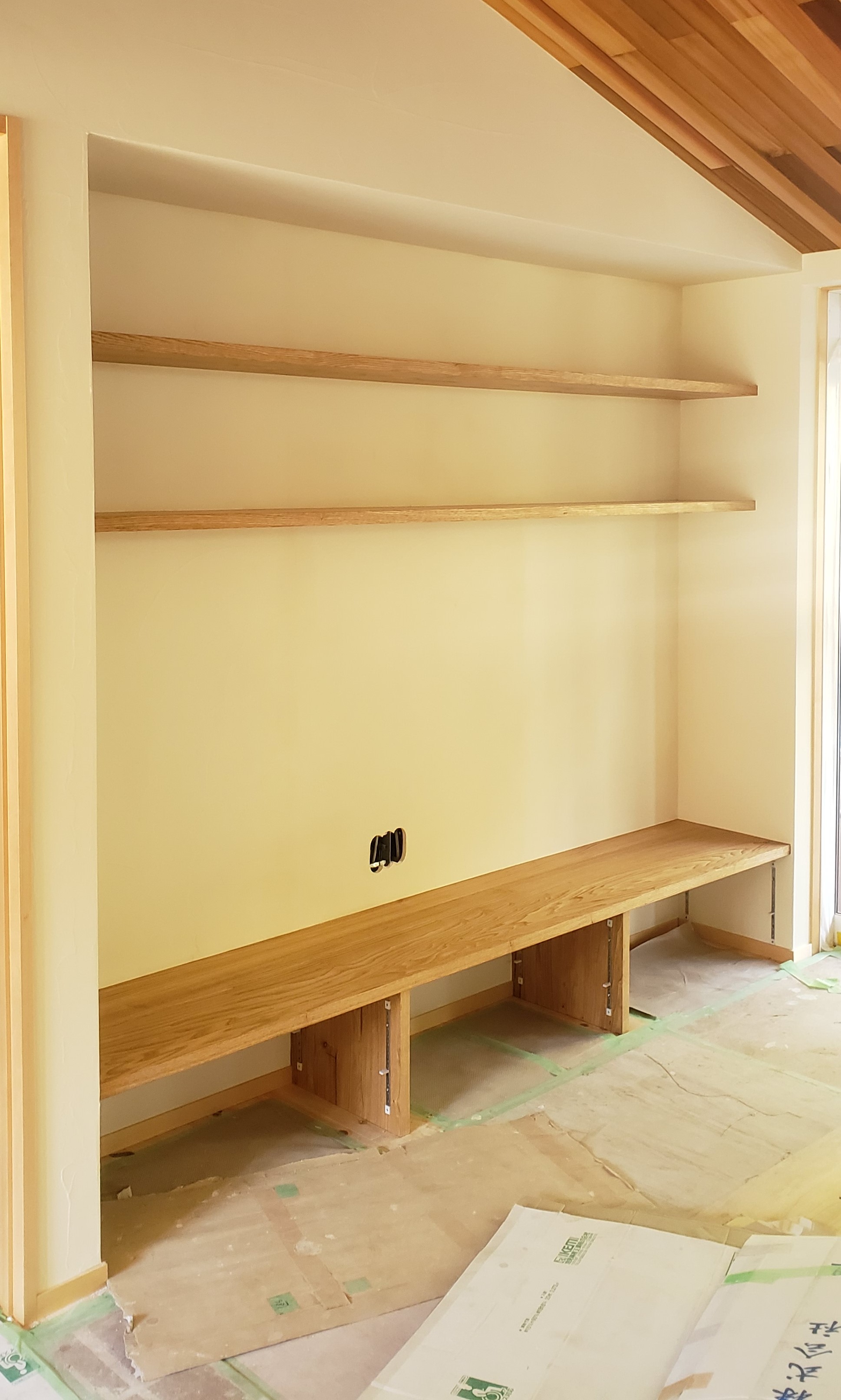 テレビ台と仕切り、上部棚2段の材料はクリです