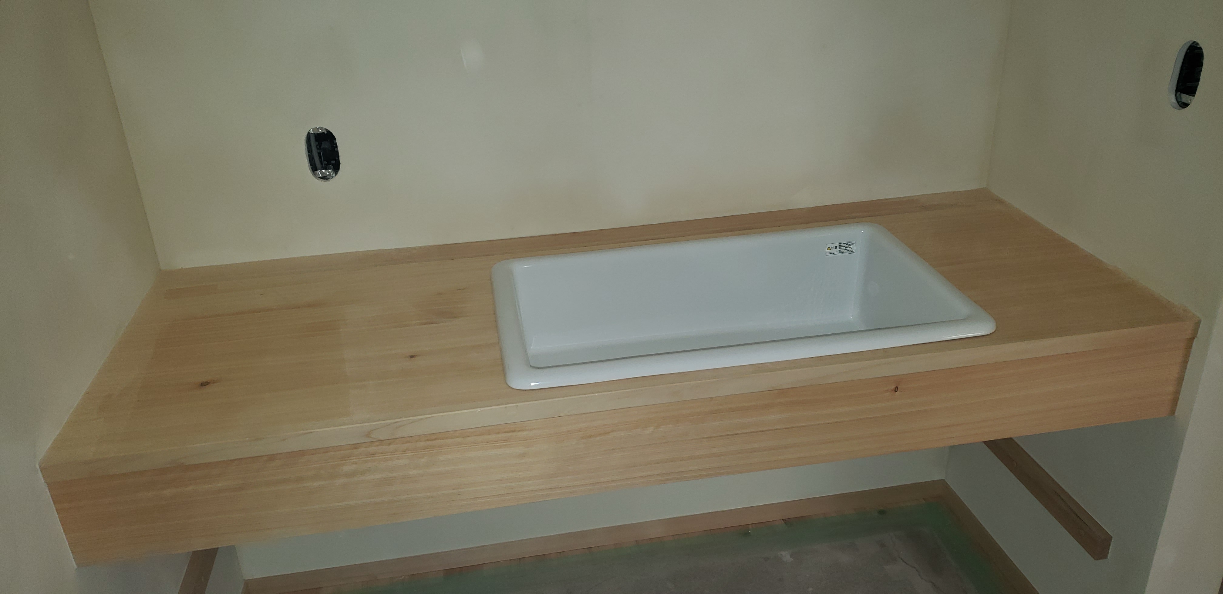 ホーム > スタッフブログ > 珪藻土塗り、製作洗面カウンター工事