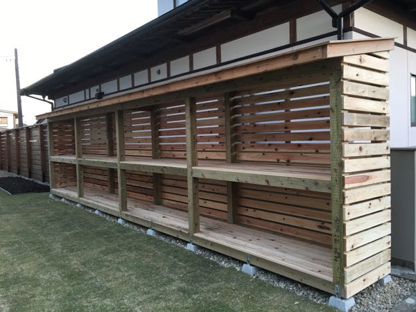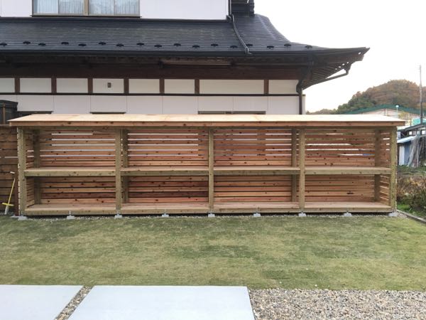 宮城県産杉と桧の薪置き棚が完成。