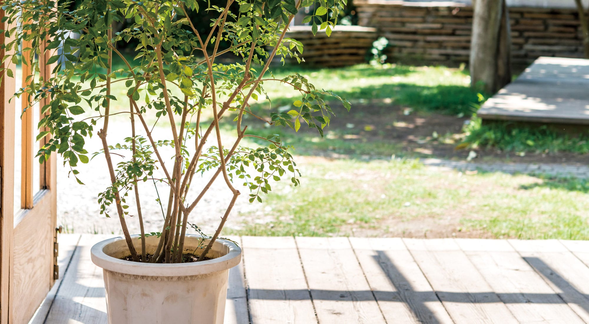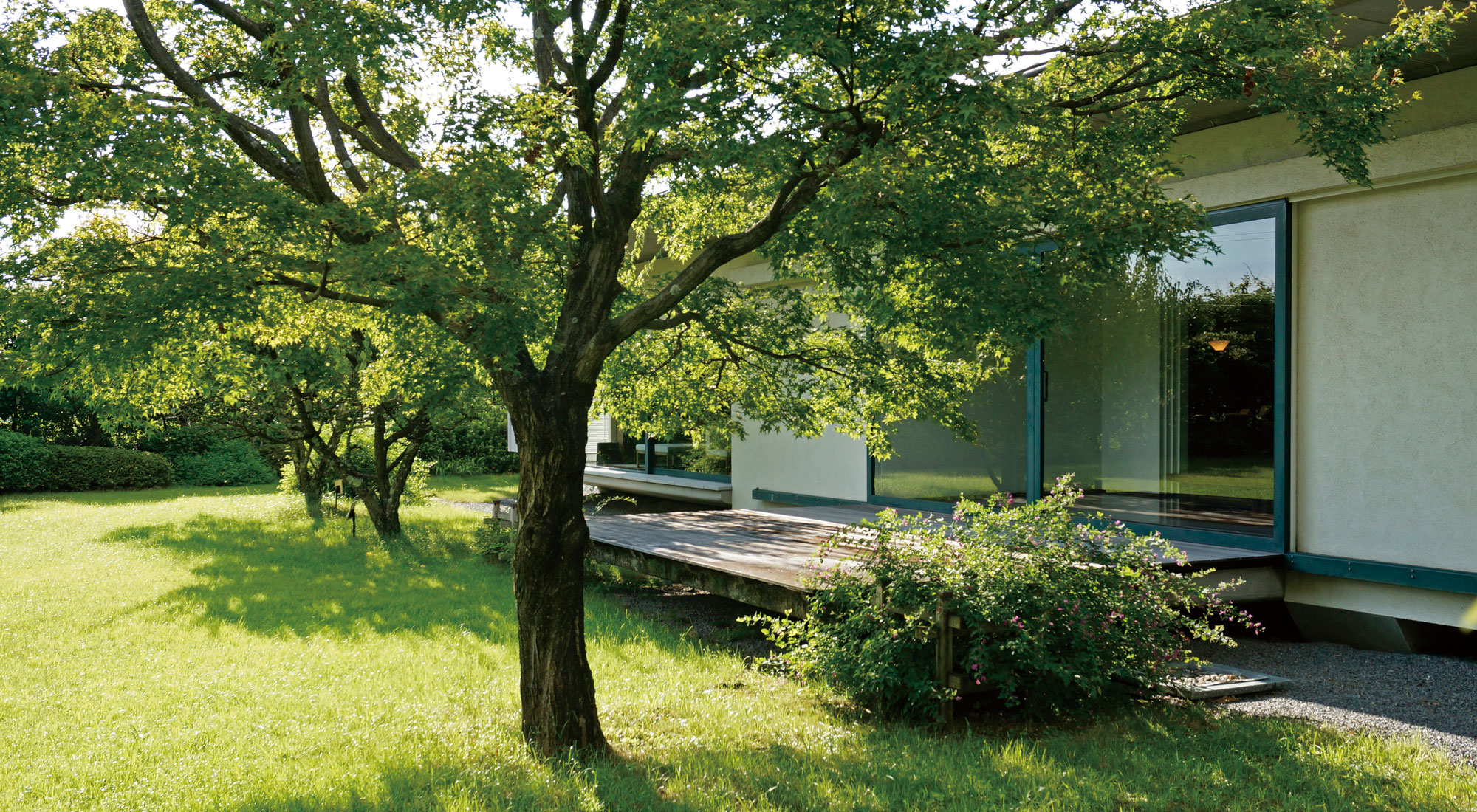 松島テラスを象徴する大きなシンボルツリーは敷地境界線に生えています。枕木のアプローチから庭にアクセスできます。