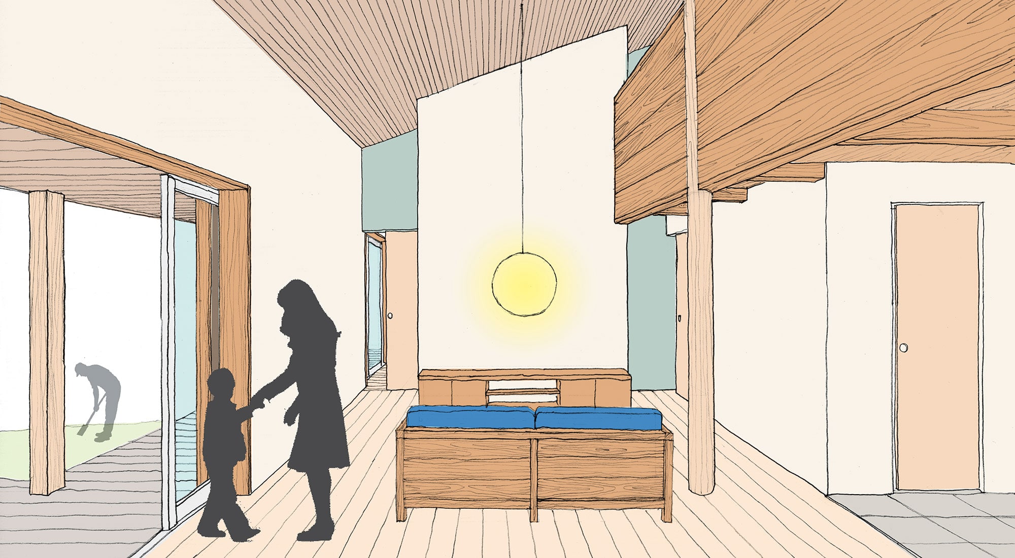 四季折々の自然に恵まれた松島町の丘の上に、ちいさなまちづくりが始まりました。2組の家族のための住宅地は、移住をお考えの方、仙台への通勤通学、そして週末にくつろぐことなど、いろんなことを大切にしたい家族に、ふさわしい場となるでしょう。思い思いに過ごせるテラスのあるくらしを楽しむこと、家族の中のほどよい距離感を大切にすること、そして、まちにとっても気持ちのよい家並みやつながりのあること、そんなことを考えながら、家づくりを進めてまいります。まちづくりは、そこに住まわれる方との話し合いが、一番大切なものと考えています。いろいろな家具の工夫や居場所づくりの提案を盛り込んだ、いえのわの魅力を、お伝えできればと思います。